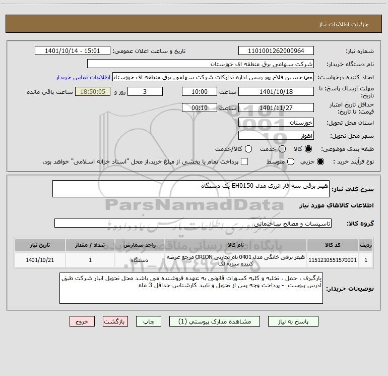 شرح کلی نیاز: هیتر برقی سه فاز انرژی مدل EH0150 یک دستگاه
