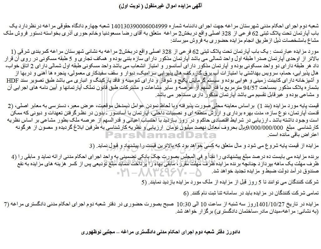 شعبه دوم اجرای احکام مدنی شهرستان مراغه جهت اجرای دادنامه شماره 140130390006004999 شعبه چهارم دادگاه حقوقی مراغه درنظردارد یک باب آپارتمان تحت پلاک ثبتی 62 فرعی از 328 اصلی واقع دربخش2 مراغه متعلق به آقای رضا مسعودنیا وخانم حوری آذری بخواسته دستور فروش ملک مشاع بامشخصات ذیل ازطریق انجام مزایده حضوری به فروش میرساند: