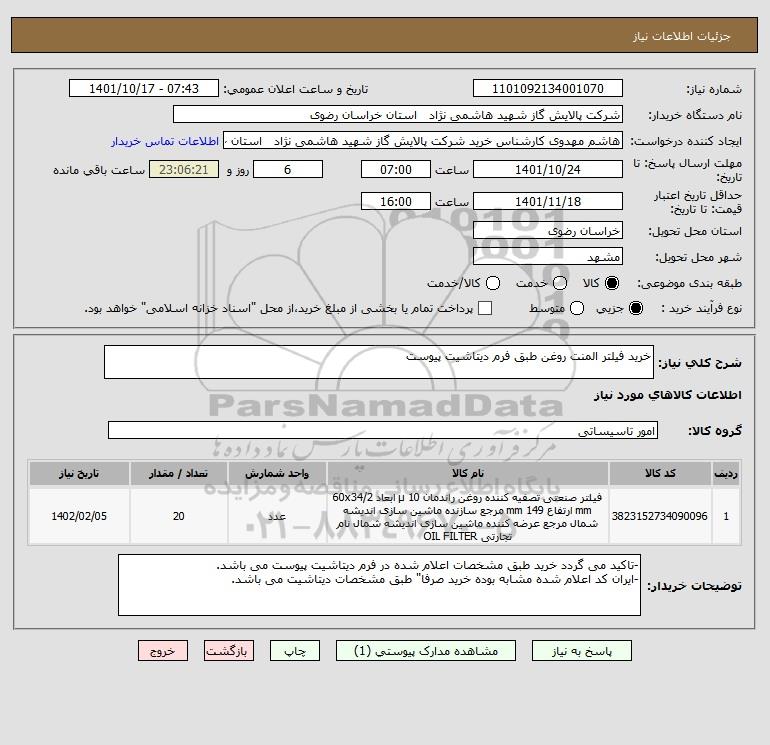 شرح کلی نیاز: خرید فیلتر المنت روغن طبق فرم دیتاشیت پیوست