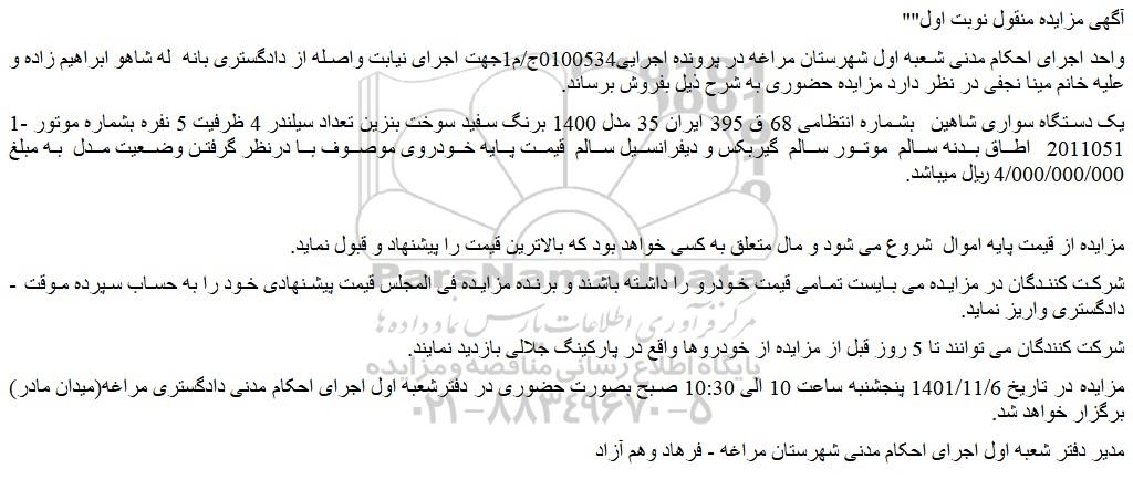 مزایده در تاریخ 1401/11/6 پنجشنبه ساعت 10 الی 10:30 صبح بصورت حضوری در دفترشعبه اول اجرای احکام مدنی دادگستری مراغه(میدان مادر) برگزار خواهد شد.