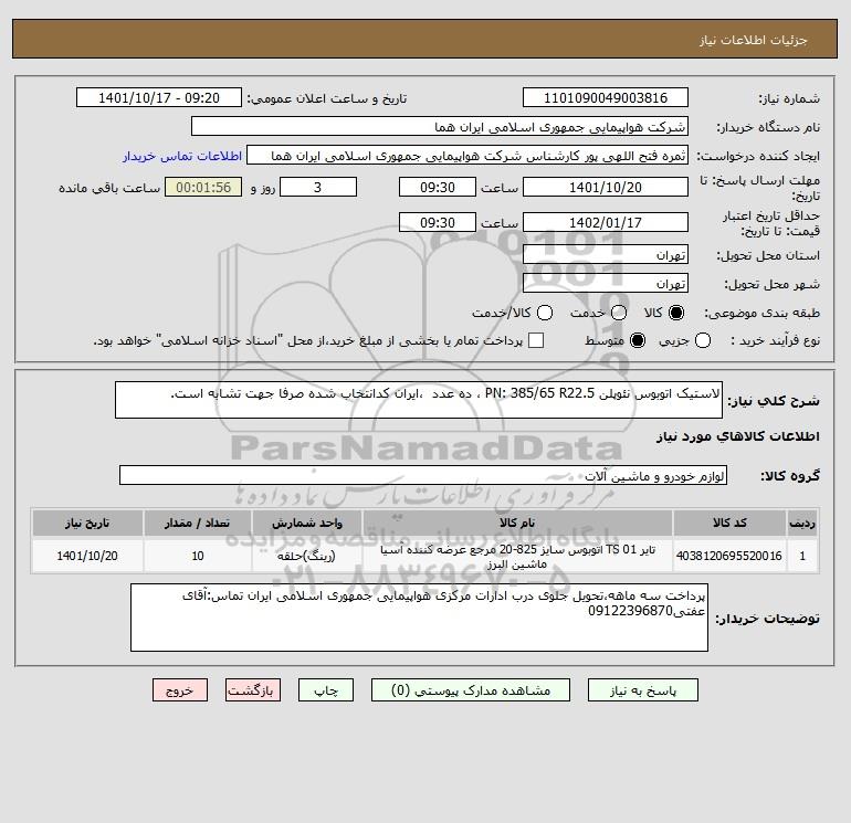 شرح کلی نیاز: لاستیک اتوبوس نئوپلن PN: 385/65 R22.5 ، ده عدد ،ایران کدانتخاب شده صرفا جهت تشابه است.