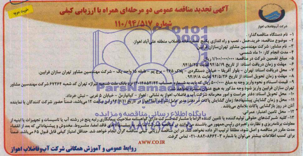 موضوع مناقصه: خرید حمل نصب و راه اندازی پکیج تصفیه خانه فاضلاب منطقه علی آباد اهواز