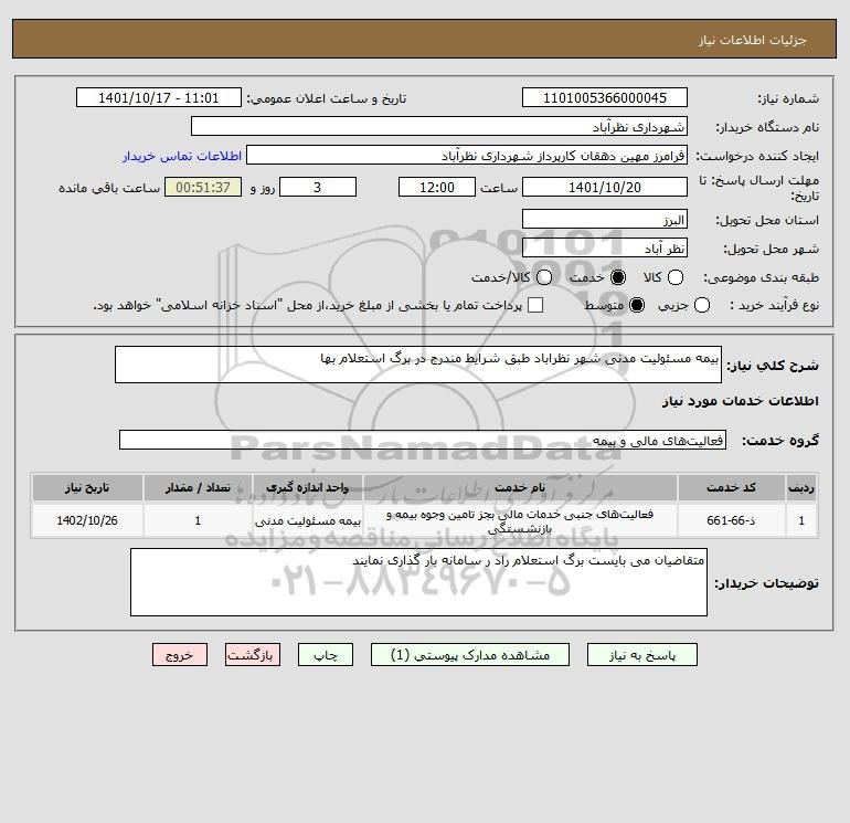 شرح کلی نیاز: بیمه مسئولیت مدنی شهر نظراباد طبق شرایط مندرج در برگ استعلام بها