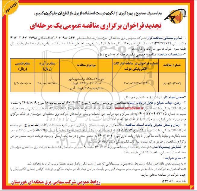 | 01/1012089/م | 2001001262000113 | خرید 4 دستگاه ترانسفورماتور کمپکت 23.04 کیلوولت با ظرفیت 150 کیلوولت امپر | 28.000.000.000 | 1.400.000.000 |
