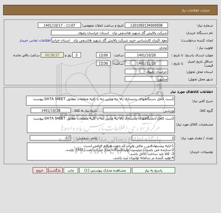 نام دستگاه خریدار:شرکت پالایش گاز شهید هاشمی نژاد استان خراسان رضوی