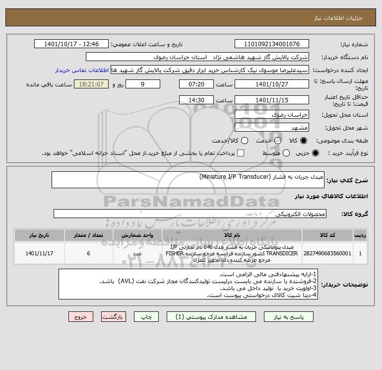 نام دستگاه خریدار:شرکت پالایش گاز شهید هاشمی نژاد استان خراسان رضوی