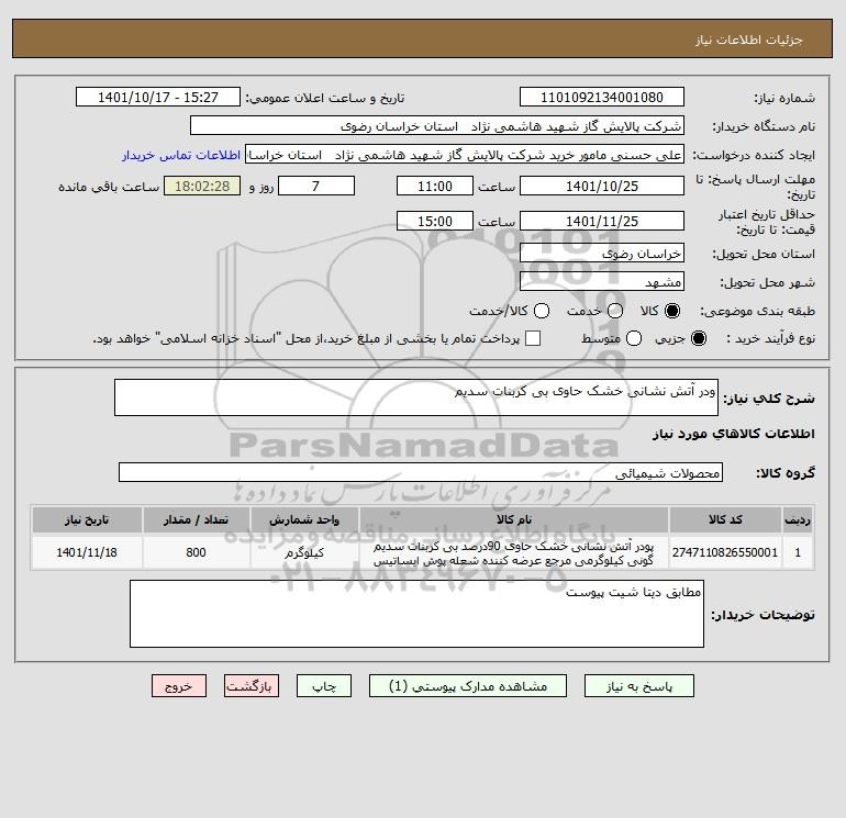 | 1 | 2747110826550001 | پودر آتش نشانی خشک حاوی 90درصد بی کربنات سدیم گونی کیلوگرمی مرجع عرضه کننده شعله پوش ایساتیس | کیلوگرم | 800 | 1401/11/18 |