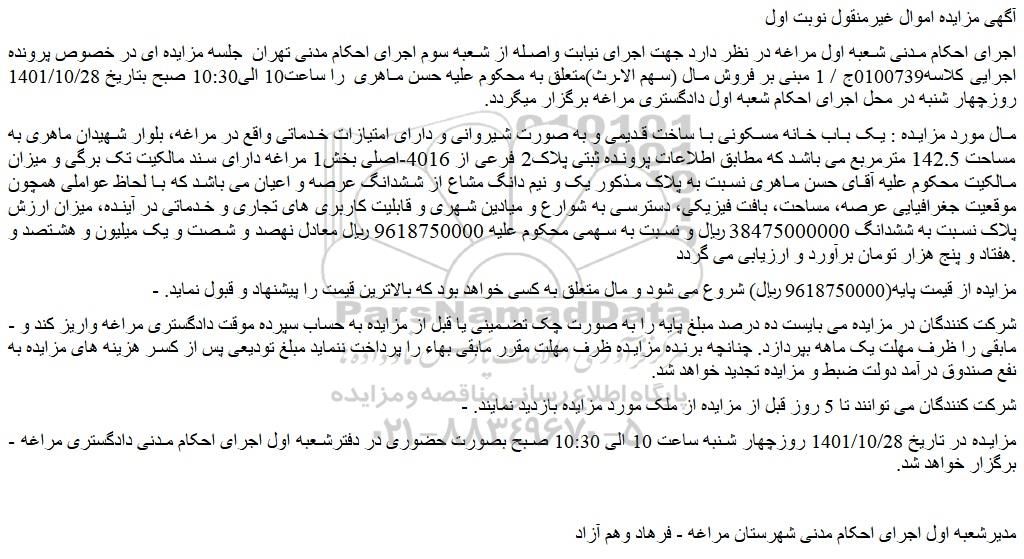 اجرای احکام مدنی شعبه اول مراغه در نظر دارد جهت اجرای نیابت واصله از شعبه سوم اجرای احکام مدنی تهران جلسه مزایده ای در خصوص پرونده اجرایی کلاسه0100739ج / 1 مبنی بر فروش مال (سهم الارث)متعلق به محکوم علیه حسن ماهری را ساعت10 الی10:30 صبح بتاریخ 1401/10/28 روزچهار شنبه در محل اجرای احکام شعبه اول دادگستری مراغه برگزار میگردد.