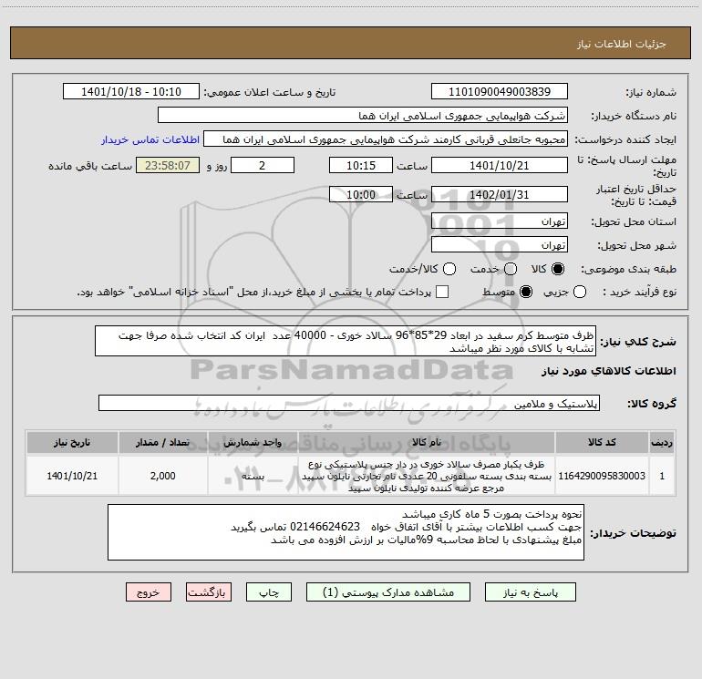شرح کلی نیاز: ظرف متوسط کرم سفید در ابعاد 29*85*96 سالاد خوری - 40000 عدد ایران کد انتخاب شده صرفا جهت تشابه با کالای مورد نظر میباشد