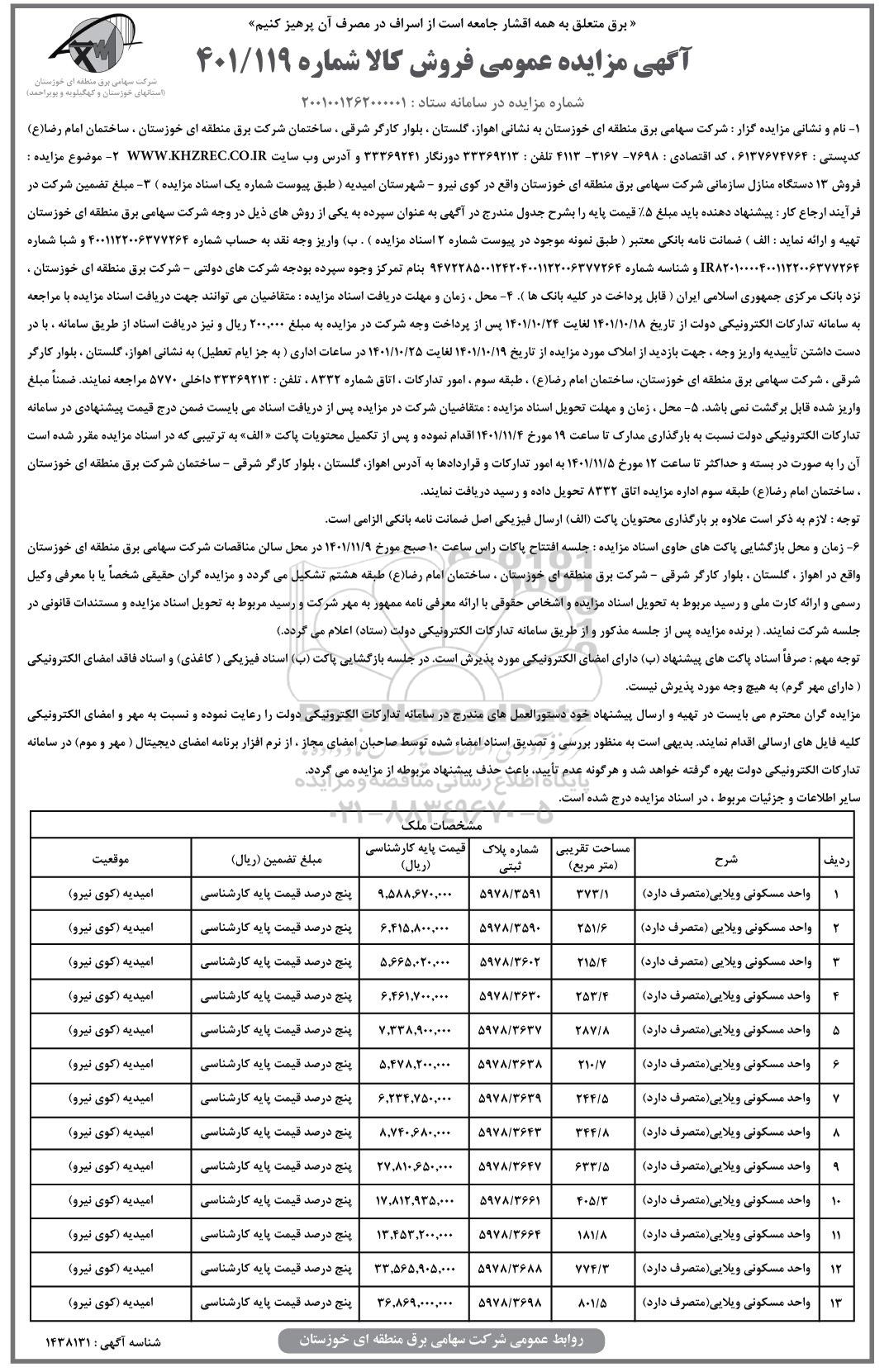 مزایده فروش 13 دستگاه منازل سازمانی, مزایده فروش 13 دستگاه منازل سازمانی