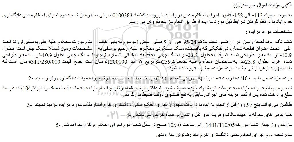 به موجب مواد 113- الی 152- قانون اجرای احکام مدنی دررابطه با پرونده کلاسه 0100383اجرائی صادره از شعبه دوم اجرای احکام مدنی دادگستری خرم آباد با درنظرگرفتن شرایط ذیل مورد مزایده ازطریق انجام مزایده بفروش می رسد.