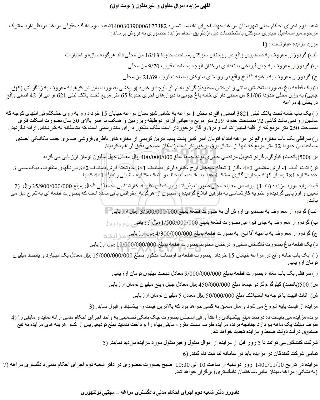 شعبه دوم اجرای احکام مدنی شهرستان مراغه جهت اجرای دادنامه شماره 140030390006177382شعبه سوم دادگاه حقوقی مراغه درنظردارد ماترک مرحوم میراسماعیل حیدری سنوکش بامشخصات ذیل ازطریق انجام مزایده حضوری به فروش برساند: