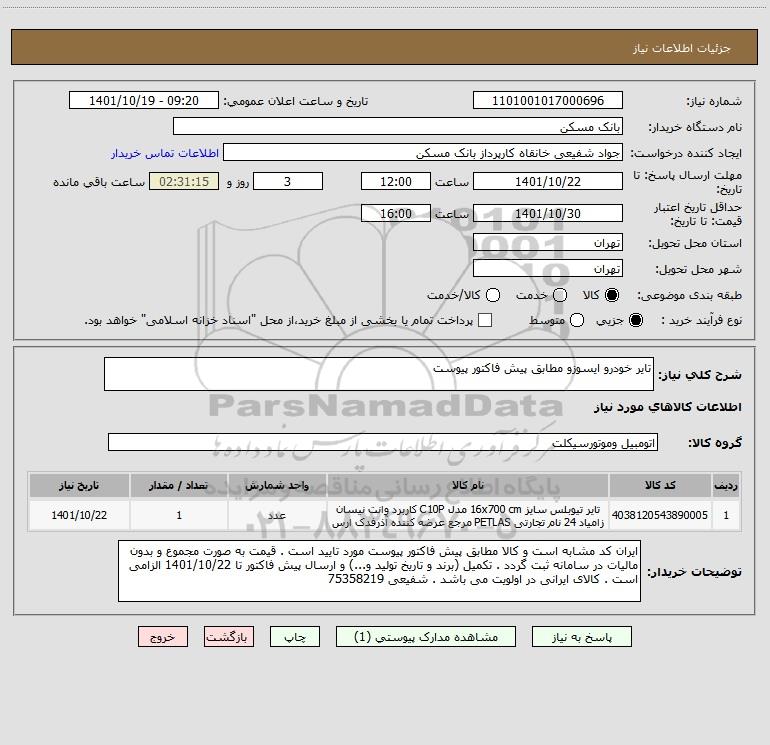 شرح کلی نیاز: تایر خودرو ایسوزو مطابق پیش فاکتور پیوست