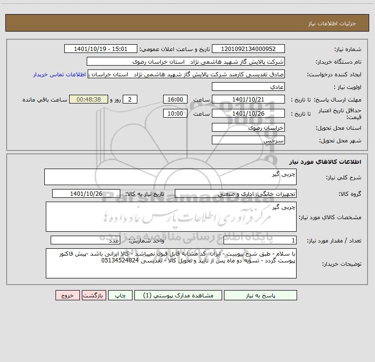 نام دستگاه خریدار:شرکت پالایش گاز شهید هاشمی نژاد استان خراسان رضوی