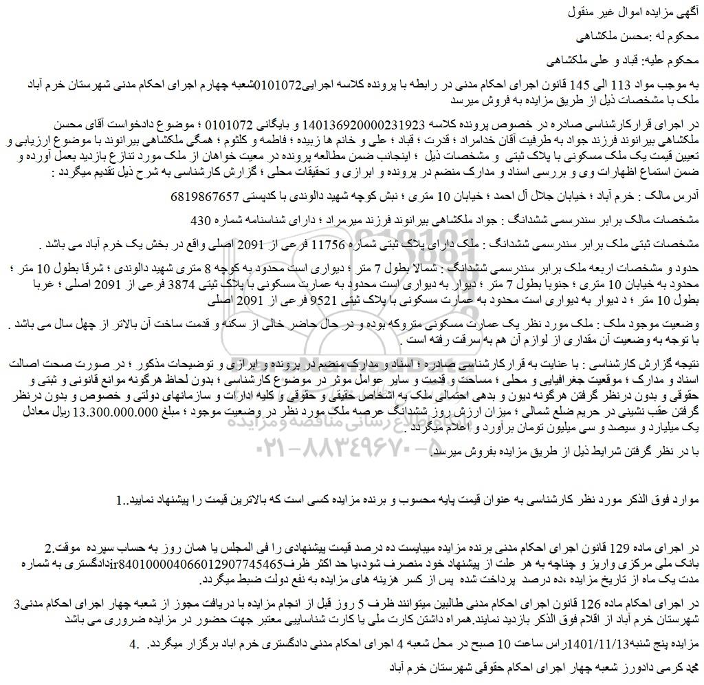به موجب مواد 113 الی 145 قانون اجرای احکام مدنی در رابطه با پرونده کلاسه اجرایی0101072شعبه چهارم اجرای احکام مدنی شهرستان خرم آباد ملک با مشخصات ذیل از طریق مزایده به فروش میرسد