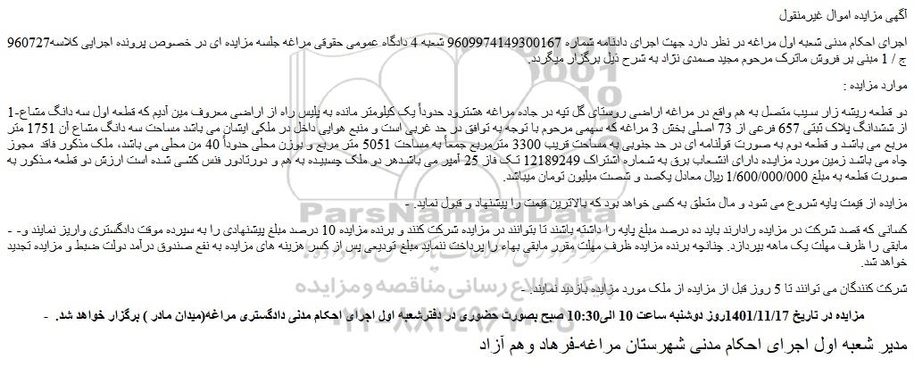 اجرای احکام مدنی شعبه اول مراغه در نظر دارد جهت اجرای دادنامه شماره 9609974149300167 شعبه 4 دادگاه عمومی حقوقی مراغه جلسه مزایده ای در خصوص پرونده اجرایی کلاسه960727 ج / 1 مبنی بر فروش ماترک مرحوم مجید صمدی نژاد به شرح ذیل برگزار میگردد.