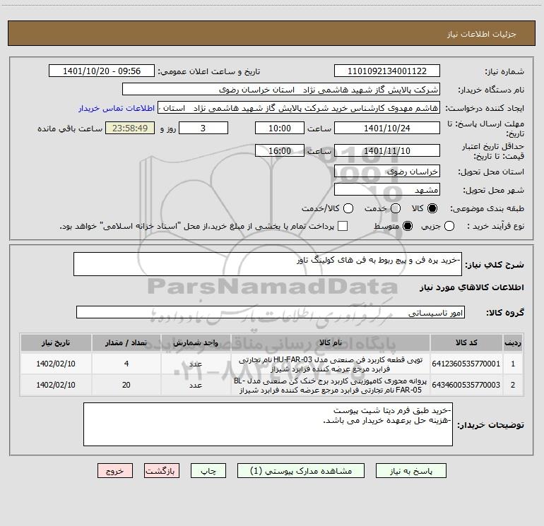 نام دستگاه خریدار:شرکت پالایش گاز شهید هاشمی نژاد استان خراسان رضوی