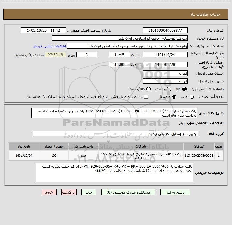 شرح کلی نیاز: پاکت مدارک بار 400*(330 PN: 920-005-064 )(40 PK = PK= 100 EA)ایران کد جهت تشابه است نحوه پرداخت سه ماه است