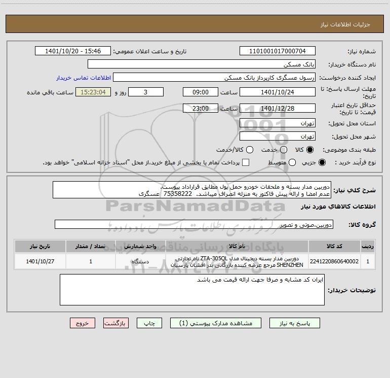 شرح کلی نیاز: دوربین مدار بسته و ملحقات خودرو حمل پول مطابق قراراداد پیوست.