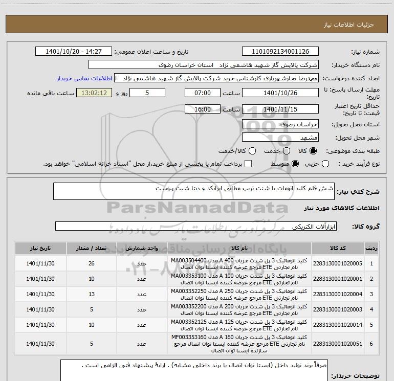 نام دستگاه خریدار:شرکت پالایش گاز شهید هاشمی نژاد استان خراسان رضوی