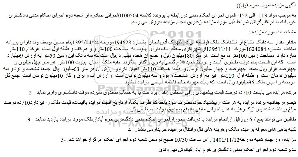 به موجب مواد 113- الی 152- قانون اجرای احکام مدنی دررابطه با پرونده کلاسه 0100504اجرائی صادره از شعبه دوم اجرای احکام مدنی دادگستری خرم آباد با درنظرگرفتن شرایط ذیل مورد مزایده ازطریق انجام مزایده بفروش می رسد.