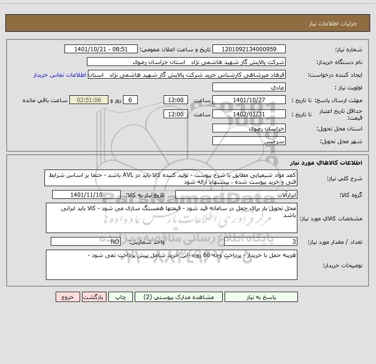 نام دستگاه خریدار:شرکت پالایش گاز شهید هاشمی نژاد استان خراسان رضوی