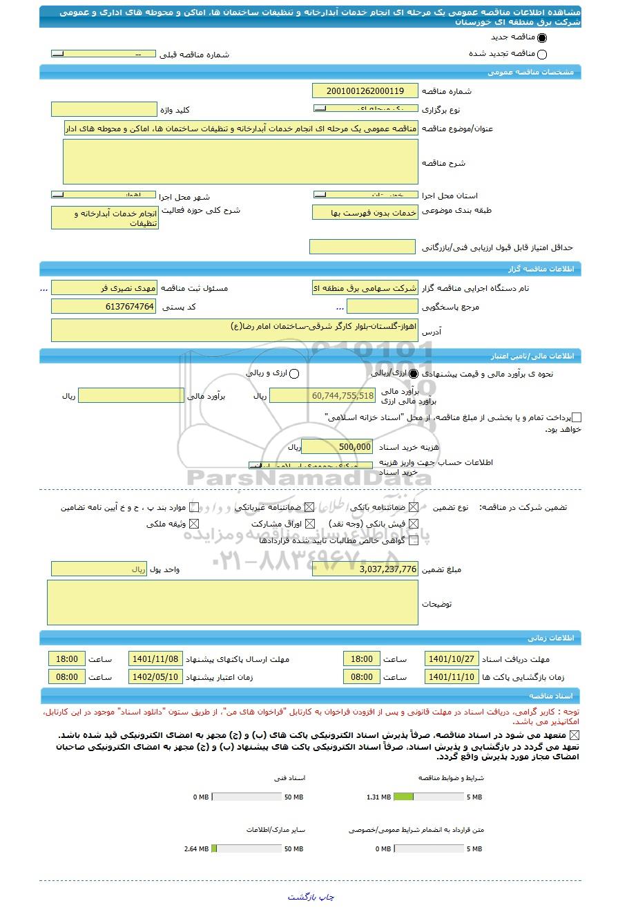نام دستگاه اجرایی مناقصه گزارشرکت سهامی برق منطقه ای خوزستانمسئول ثبت مناقصهمهدی نصیری فر