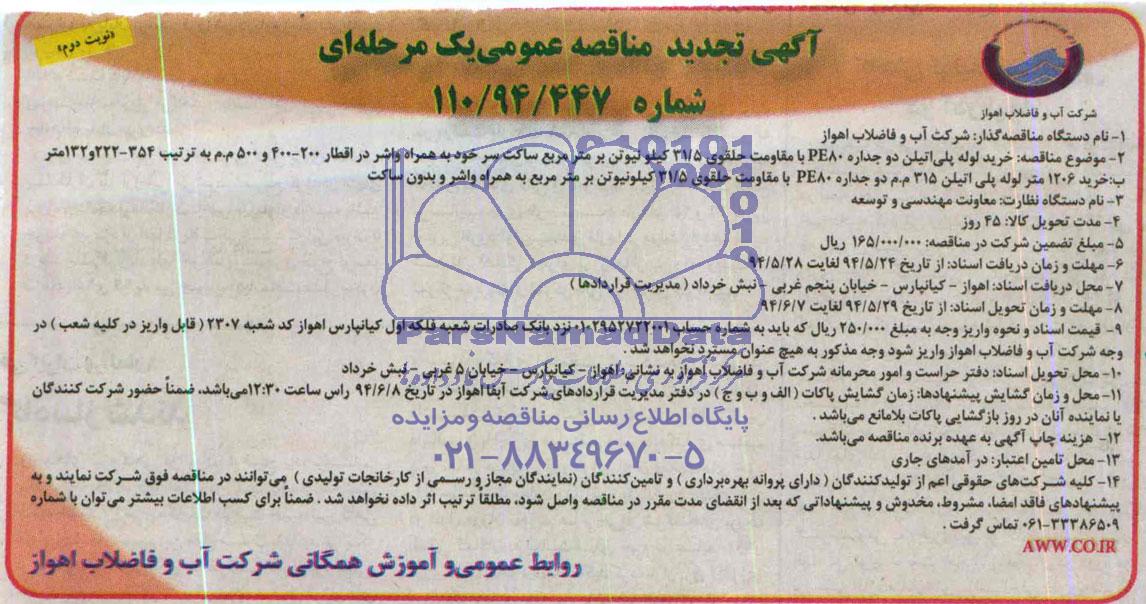 تجدید مناقصه خرید لوله پلی اتیلن دو جداره PE80 و از کلیه افراد متخصص و شرکتها واجد شرایط دعوت به عمل میآید در مناقصه با کد خبرگزاری پارس نماد: 538333 شرکت نمایند.