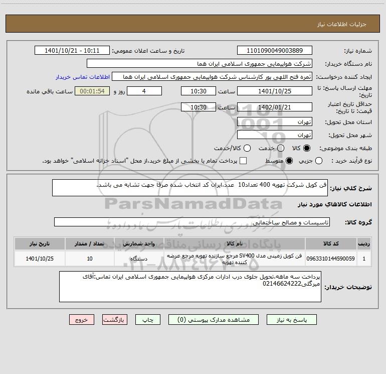 شرح کلی نیاز: فن کویل شرکت تهویه 400 تعداد10 عدد،ایران کد انتخاب شده صرفا جهت تشابه می باشد.