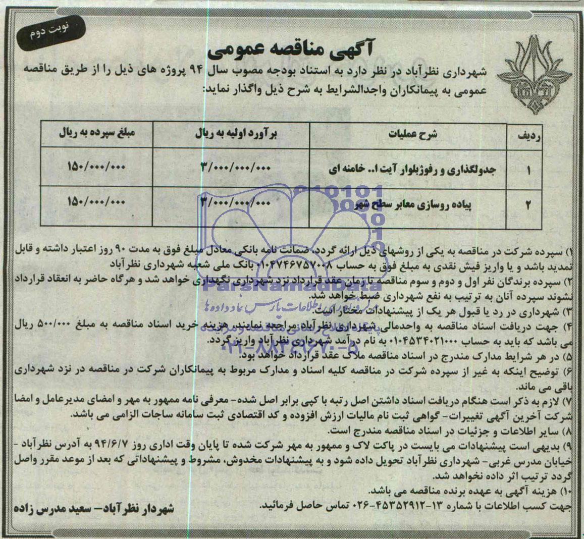 شهرداری نظرآباد در نظر دارد به استناد بودجه مصوب سال 94 پروژه های ذیل را از طریق مناقصه عمومی به پیمانکاران واجدالشرایط به شرح ذیل واگذار نماید.