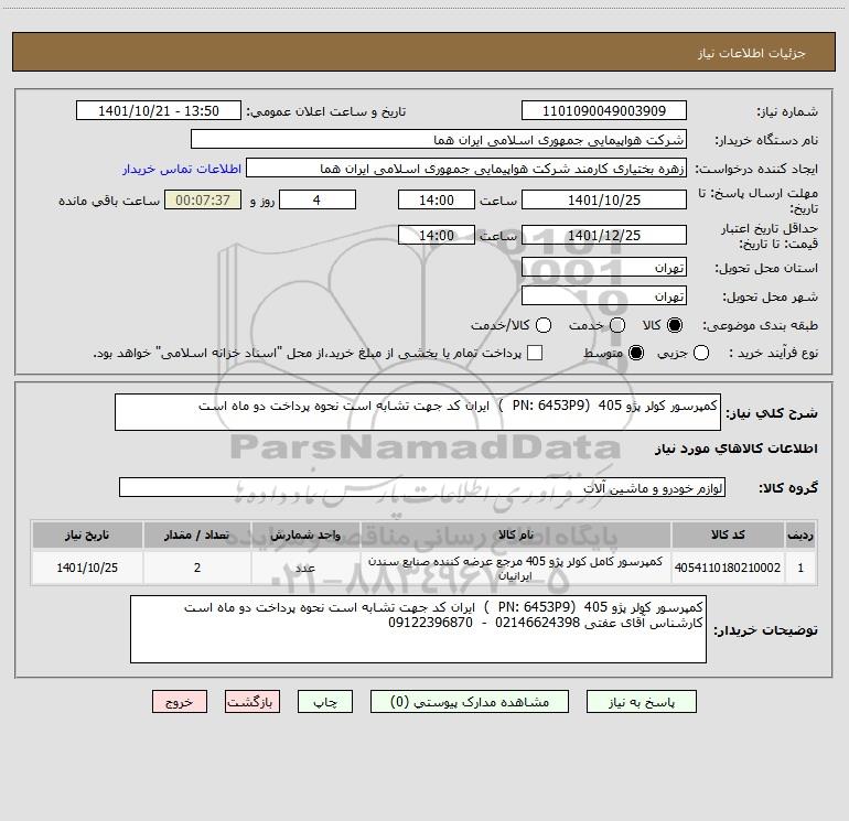 شرح کلی نیاز: کمپرسور کولر پژو 405 (PN: 6453P9 ) ایران کد جهت تشابه است نحوه پرداخت دو ماه است