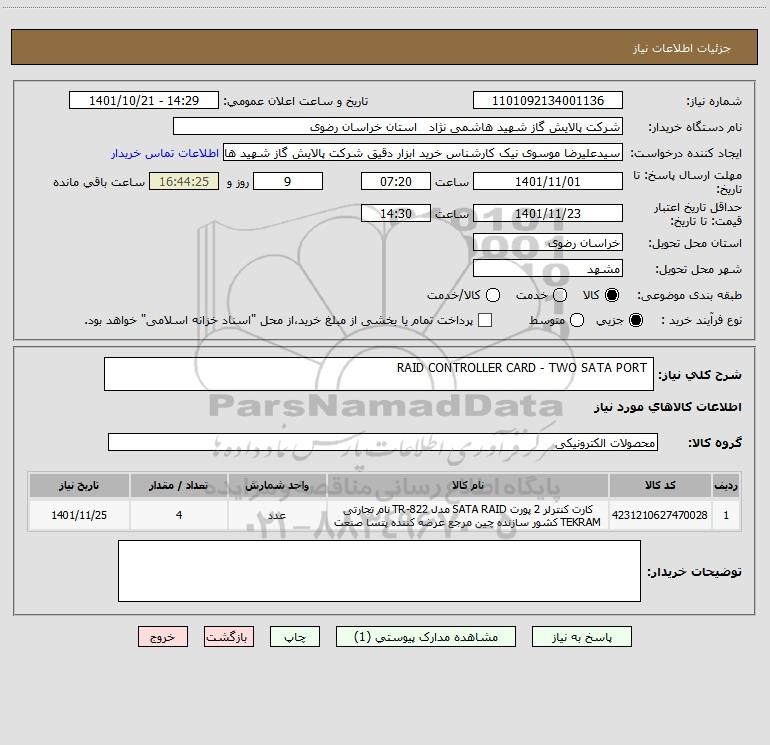 | 1 | 4231210627470028 | کارت کنترلر 2 پورت SATA RAID مدل TR-822 نام تجارتی TEKRAM کشور سازنده چین مرجع عرضه کننده پتسا صنعت | عدد | 4 | 1401/11/25 |