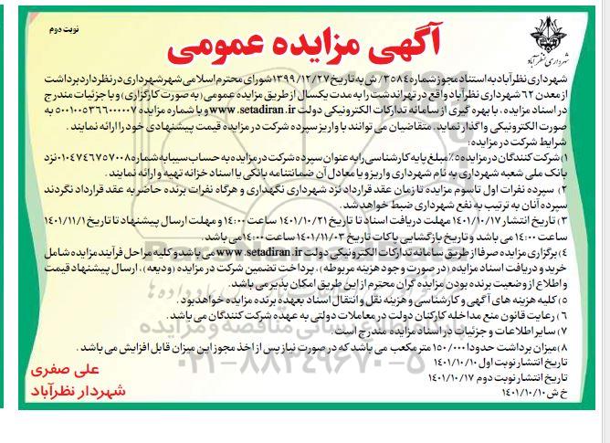 شهرداری نظرآباد در نظر دارد برداشت از معدن 62 شهرداری نظرآباد واقع در تهراندشت را به مدت یکسال از طریق مزایده عمومی به صورت کارگزاری و با جزییات مندرج در اسناد مزایده با بهره گیری از سامانه تدارکات الکترونیکی دولت و با شماره مزایده 5001005366000007 به صورت الکرونیکی واگذار نماید متقاضیان می توانند با واریز سپرده شرکت در مزایده قیمت پینشهادی خود را ارائه نمایند.