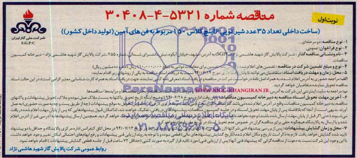 مناقصه ساخت داخلی تعداد 35 عدد شیر توپی 6 اینچ کلاس از کلیه افراد متخصص و شرکتها واجد شرایط دعوت به عمل میآید در مناقصه با کد خبرگزاری پارس نماد: 539135 شرکت نمایند.