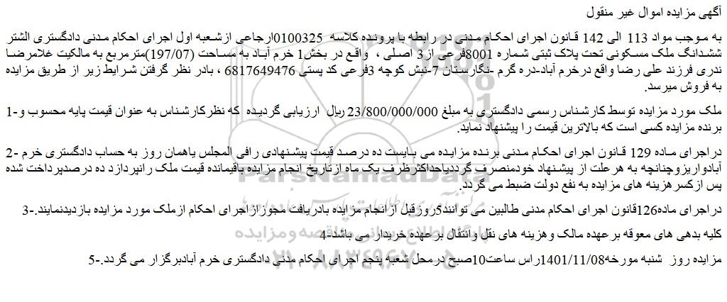 به موجب مواد 113 الی 142 قانون اجرای احکام مدنی در رابطه با پرونده کلاسه 0100325ارجاعی ازشعبه اول اجرای احکام مدنی دادگستری الشتر ششدانگ ملک مسکونی تحت پلاک ثبتی شماره 8001فرعی از3 اصلی ، واقع در بخش1 خرم آباد به مساحت (197/07)مترمربع به مالکیت غلامرضا ندری فرزند علی رضا واقع درخرم آباد-دره گرم -نگارستان 7-نبش کوچه 3فرعی کد پستی 6817649476 ، بادر نظر گرفتن شرایط زیر از طریق مزایده به فروش میرسد.