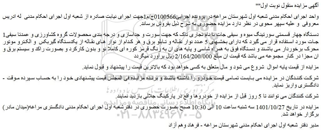 واحد اجرای احکام مدنی شعبه اول شهرستان مراغه در پرونده اجرایی0100566ج/م1جهت اجرای نیابت صادره از شعبه اول اجرای احکام مدنی  له ادریس معروفی  و علیه سپهر محوی در نظر دارد مزایده حضوری به شرح ذیل بفروش برساند.