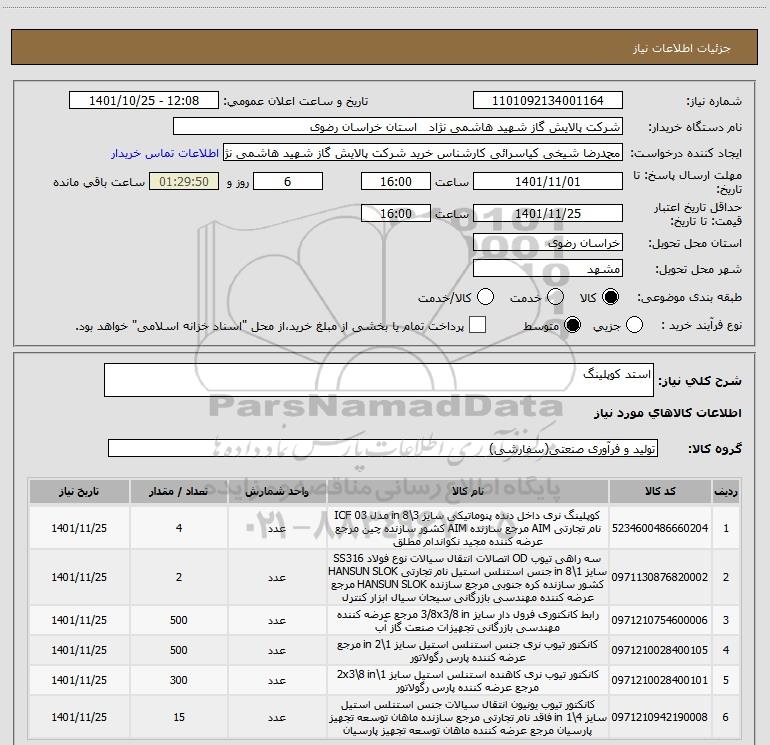 نام دستگاه خریدار:شرکت پالایش گاز شهید هاشمی نژاد استان خراسان رضوی