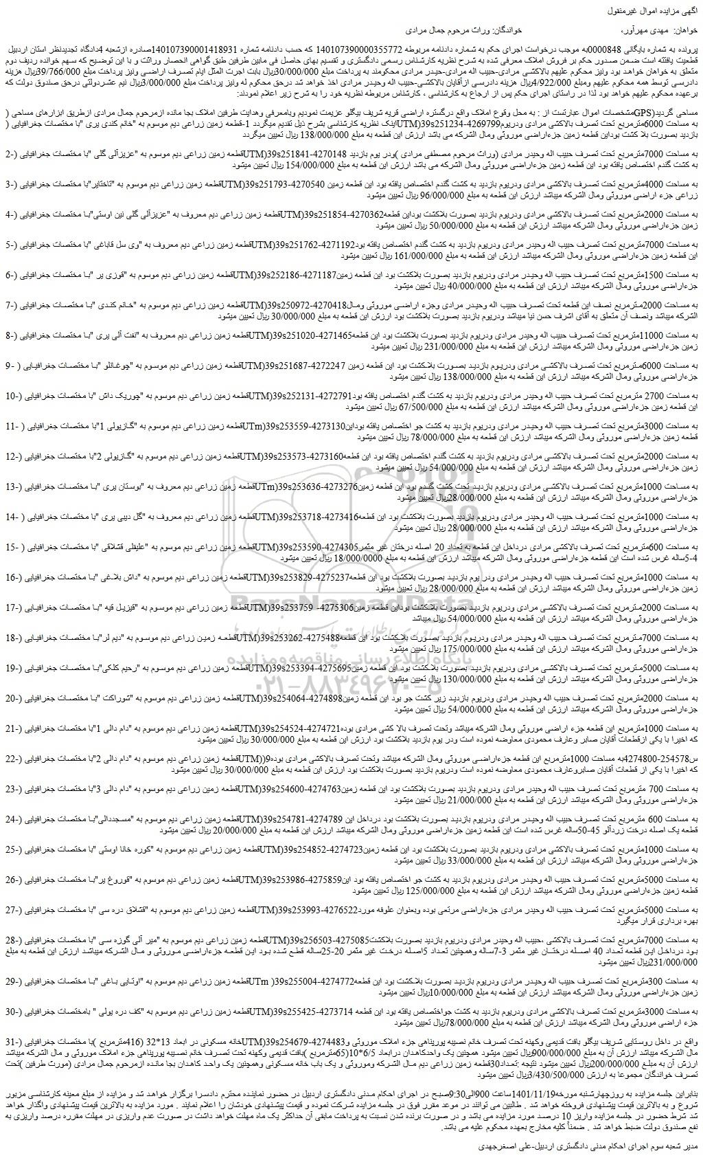 پرونده به شماره بایگانی 0000848به موجب درخواست اجرای حکم به شماره دادنامه مربوطه 140107390000355772 که حسب دادنامه شماره 140107390001418931صادره ازشعبه 4دادگاه تجدیدنظر استان اردبیل قطعیت یافتته است ضمن صدور حکم بر فروش املاک معرفی شده به شرح نظریه کارشناس رسمی دادگستری و تقسیم بهای حاصل فی مابین طرفین طبق گواهی انحصار وراثت و با این توضیح که سهم خوانده ردیف دوم متعلق به خواهان خواهد بود ونیز محکوم علیهم بالاکشی مرادی-حبیب اله مرادی-حیدر مرادی محکومند به پرداخت مبلغ 30/000/000ریال بابت اجرت المثل ایام تصرف اراضی ونیز پرداخت مبلغ 39/766/000ریال هزینه دادرسی توسط همه محکوم علیهم ومبلغ 4/922/000ریال هزینه دادرسی ازآقایان بالاکشی-حبیب اله وحیدر مرادی اخذ خواهد شد درحق محکوم له ونیز پرداخت مبلغ 3/000/000ریال نیم عشردولتی درحق صندوق دولت که برعهده محکوم علیهم خواهد بود لذا در راستای اجرای حکم پس از ارجاع به کارشناسی ، کارشناس مربوطه نظریه خود را به شرح زیر اعلام نمودند: