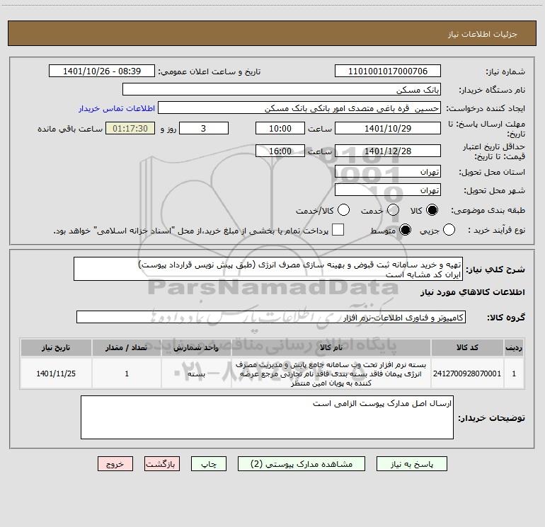 شرح کلی نیاز: تهیه و خرید سامانه ثبت قبوض و بهینه سازی مصرف انرژی (طبق پیش نویس قرارداد پیوست)
