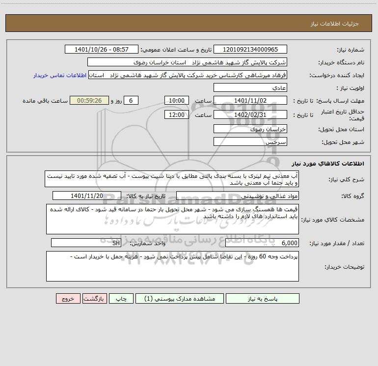 نام دستگاه خریدار:شرکت پالایش گاز شهید هاشمی نژاد استان خراسان رضوی
