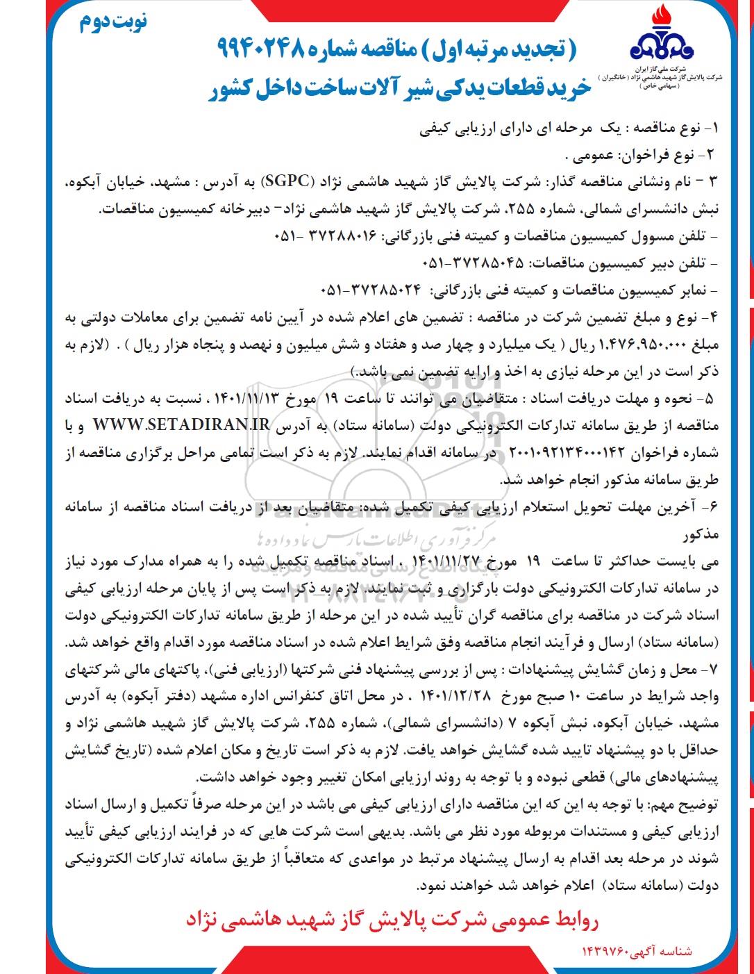 تجدید مناقصه خرید قطعات یدکی شیرآلات ساخت داخل کشور- نوبت دوم از کلیه افراد متخصص و شرکتها واجد شرایط دعوت به عمل میآید در مناقصه با کد خبرگزاری پارس نماد: 5398294 شرکت نمایند.