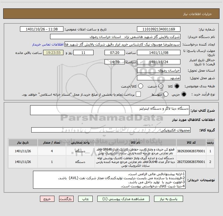 نام دستگاه خریدار:شرکت پالایش گاز شهید هاشمی نژاد استان خراسان رضوی