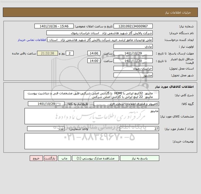 نام دستگاه خریدار:شرکت پالایش گاز شهید هاشمی نژاد استان خراسان رضوی