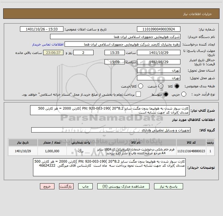 شرح کلی نیاز: کارت سوار شدن به هواپیما بدون مگنت سایز 8.2*20 )190-003-920 :PN )کارتن 2000 = هر کارتن 500 عددی )ایران کد جهت تشابه است