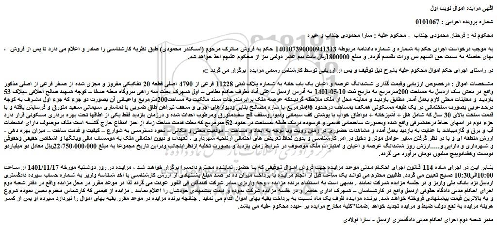 ، به موجب درخواست اجرای حکم به شماره و شماره دادنامه مربوطه 140107390000941313 حکم به فروش ماترک مرحوم (اسکندر محمودی) طبق نظریه کارشناسی را صادر و اعلام می دارد تا پس از فروش بهای حاصله به نسبت حق السهم بین وراث تقسیم گردد. و مبلغ 1800000ریال بابت نیم عشر دولتی نیز از محکوم علیهم اخذ خواهد شد.