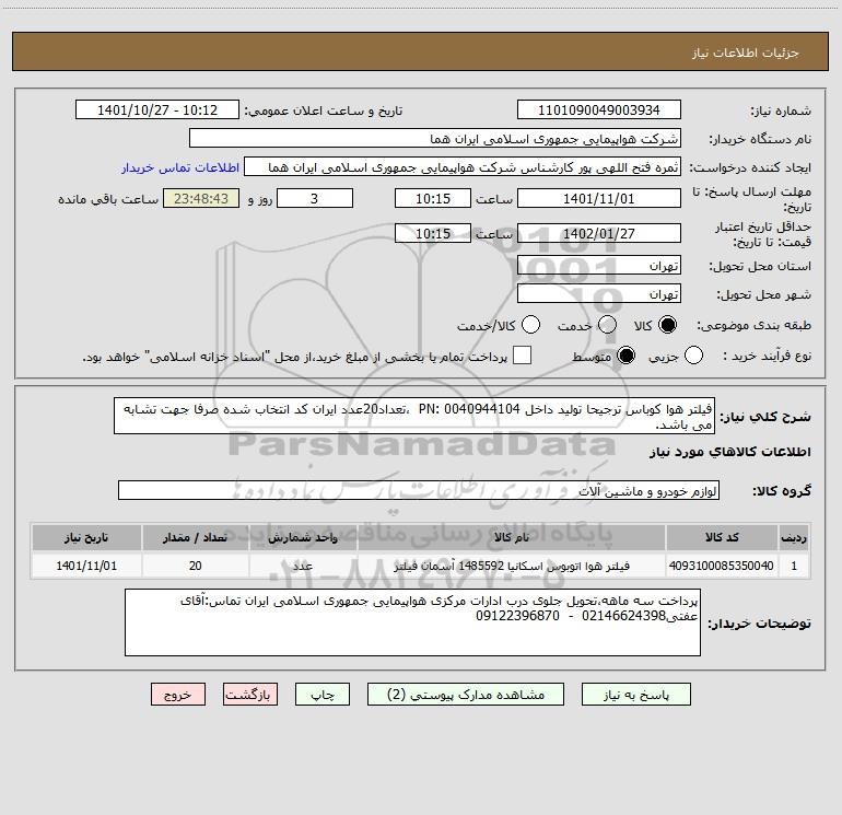 استعلام فیلتر هوا کوباس ترجیحا تولید داخل PN: 0040944104 ،تعداد20عدد ایران کد انتخاب شده صرفا جهت تشابه می باشد., استعلام فیلتر هوا کوباس ترجیحا تولید داخل PN: 0040944104 ،تعداد20عدد ایران کد انتخاب شده صرفا جهت تشابه می باشد.