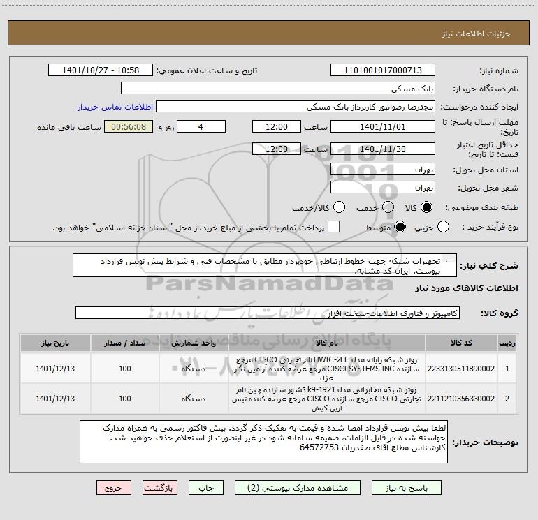 شرح کلی نیاز: تجهیزات شبکه جهت خطوط ارتباطی خودپرداز مطابق با مشخصات فنی و شرایط پیش نویس قرارداد پیوست. ایران کد مشابه.