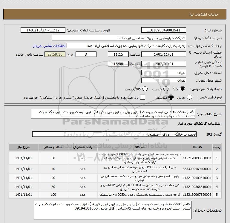توضیحات خریدار:اقلام نظافت به شرح لیست پیوست ( پارو , بیل , جارو , تی , فرچه ) طبق لیست پیوست - ایران کد جهت تشابه است نحوه پرداخت دو ماه است کارشناس آقای مایلی 09194101066