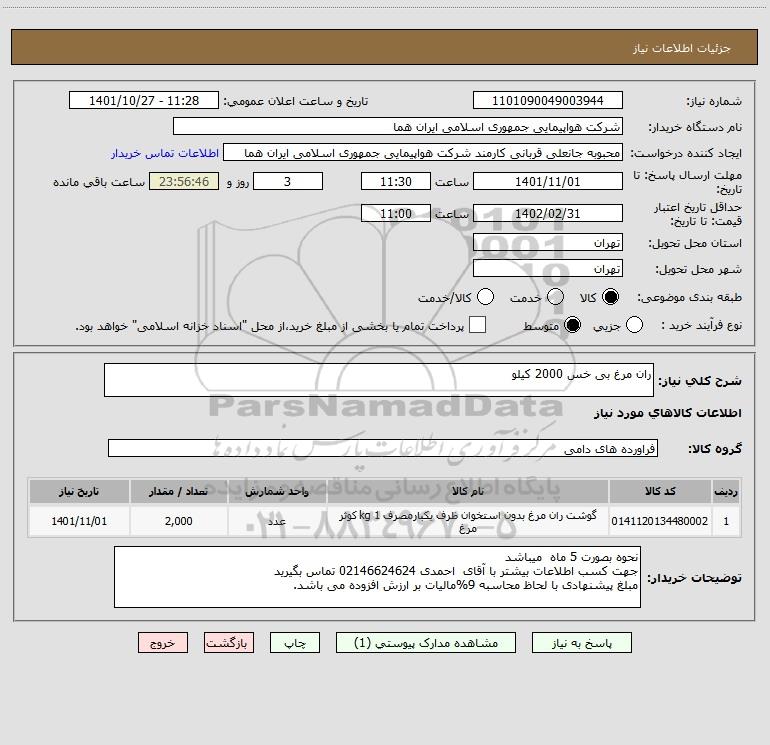 شرح کلی نیاز: ران مرغ بی خس 2000 کیلو