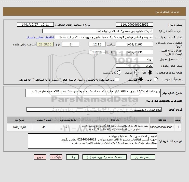 شرح کلی نیاز: پنیر خامه ای 1/5 کیلویی - 200 کیلو - ایران کد انتخاب شده صرفا جهت تشابه با کالای مورد نظر میباشد